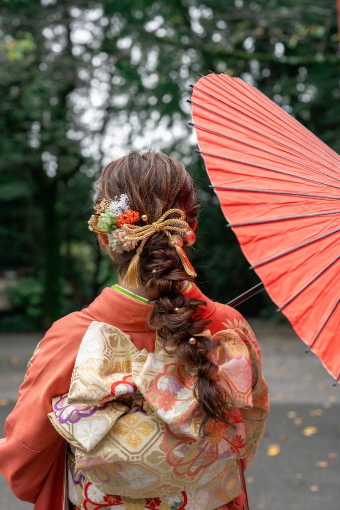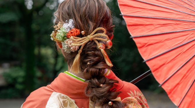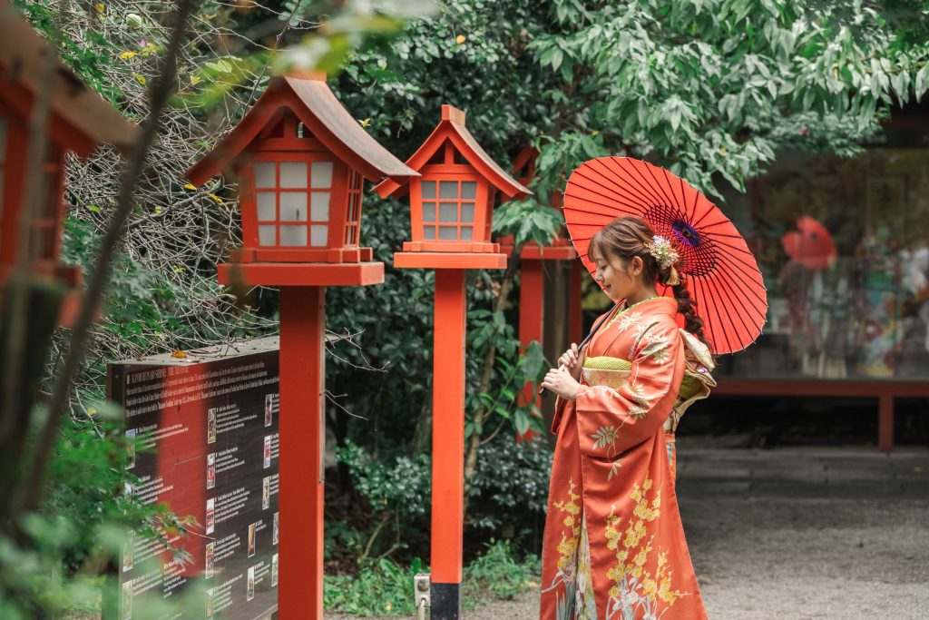 新緑と振袖の赤、そして灯篭の朱色がとても色鮮やかで素敵ですね。前日までは雨が降っていたので、境内の植物は重い雰囲気がありますが、それがまた幻想的なものになりますね☺