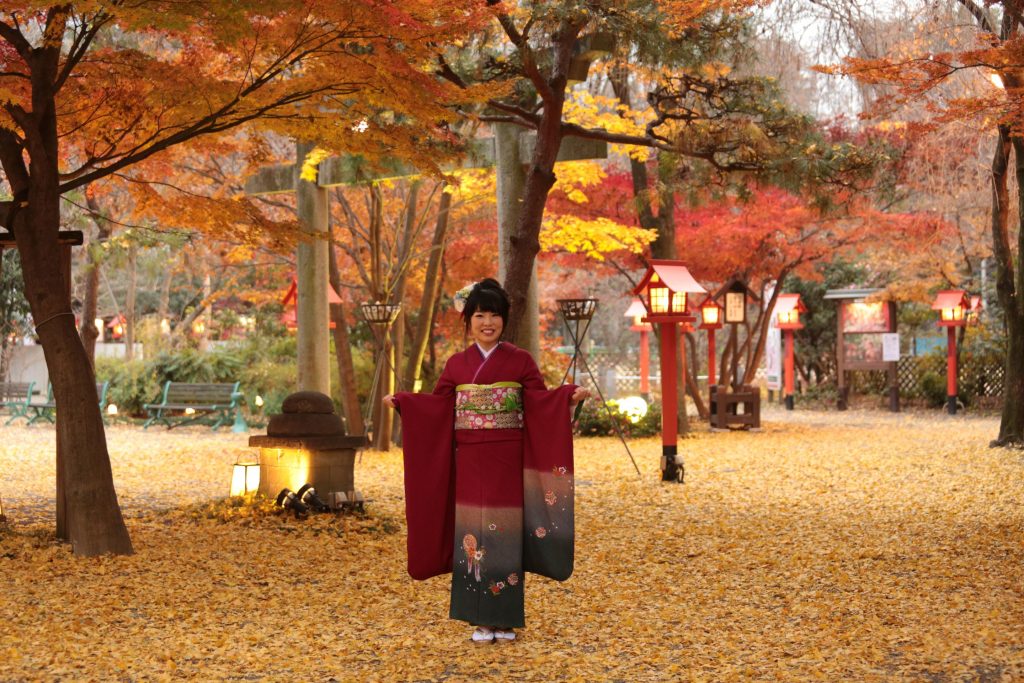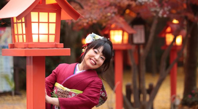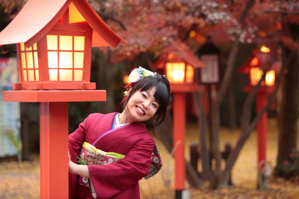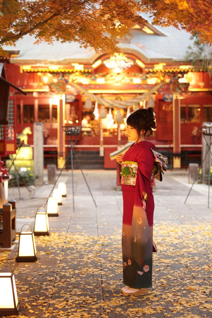 その上で行う和装の撮影はとてもよく映えます。夕方になると神社境内の灯篭に明かりがつき、とても神秘的な雰囲気になります。(冬は暗くなるのが早いので時間との勝負です・・・💦)
