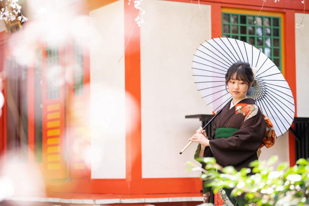落ち着いた色味の振袖と和傘が品格を感じさせるまさに絵になる1枚です…