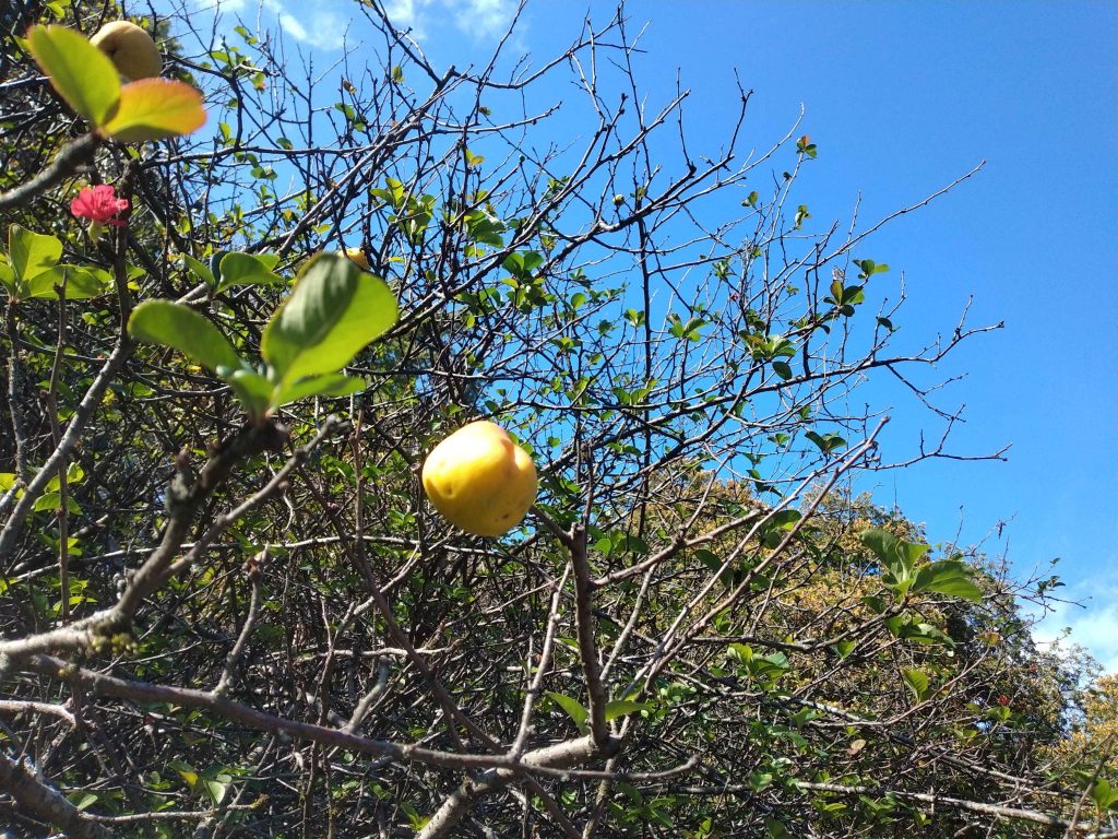 熟れた木瓜の実のとなりには「春でしたっけ?」と勘違いしてしまった花も咲いています…(笑) 今年は10月中旬頃まで気温25度を超える夏日がありましたね💦
