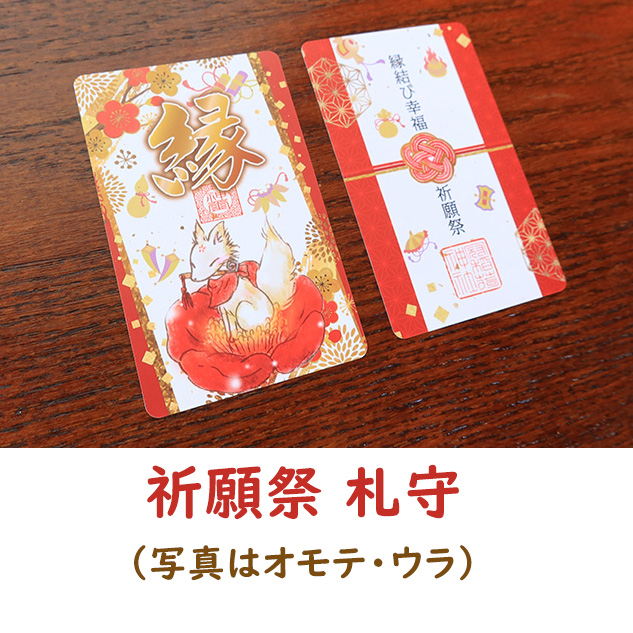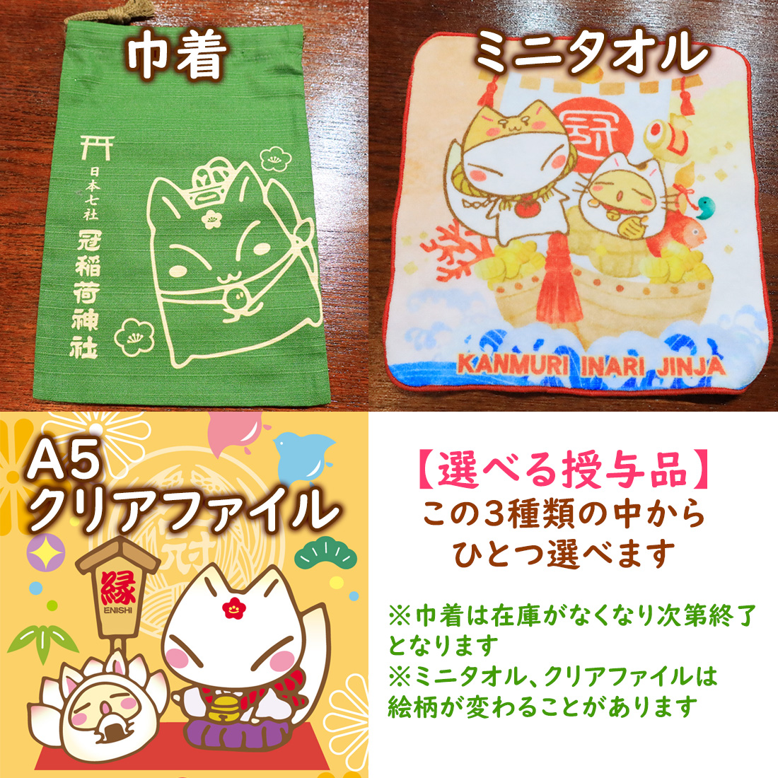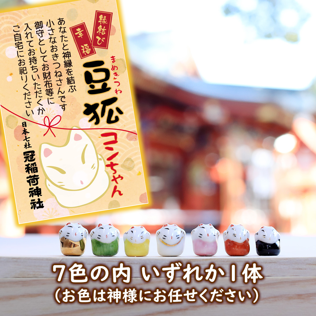 【授与品】守札(縁)、豆狐(7色の内いずれか1体)、浄め塩(3種類の内1ずれか1つ)と選べる授与品(いずれか1つ)を授与致します。