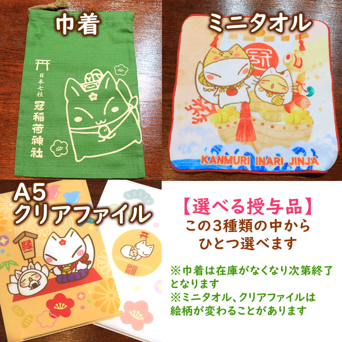 巾着袋、ミニタオルハンカチ、A5クリアファイル(A4の半分)の内から1つ選べます。