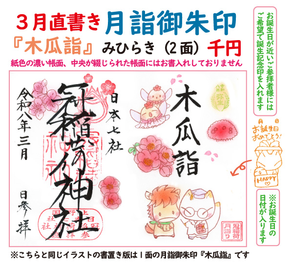 『木瓜詣』は3月のご参拝記念御朱印で、直書きの月詣御朱印(みひらき)と同じイラストとなります。